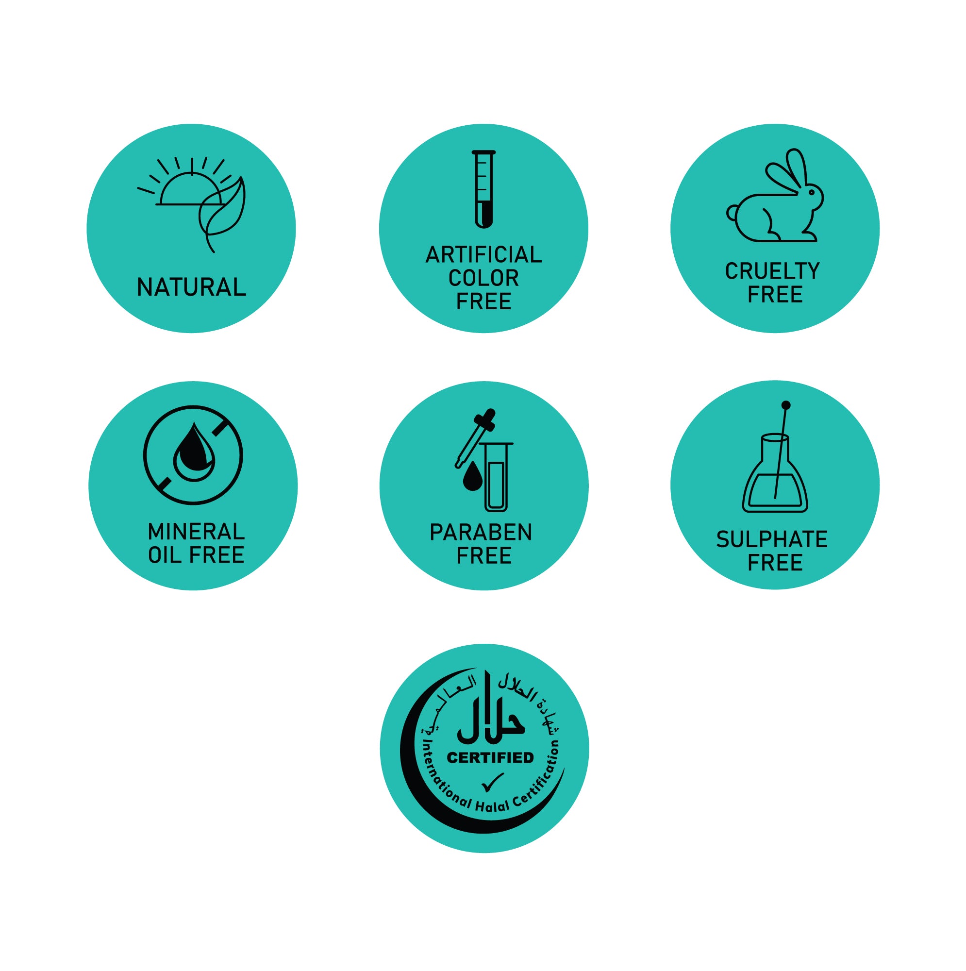 Natural, Artificial Color Free, Cruelty Free, Mineral Oil Free, Paraben Free, Sulphate Free, Halal