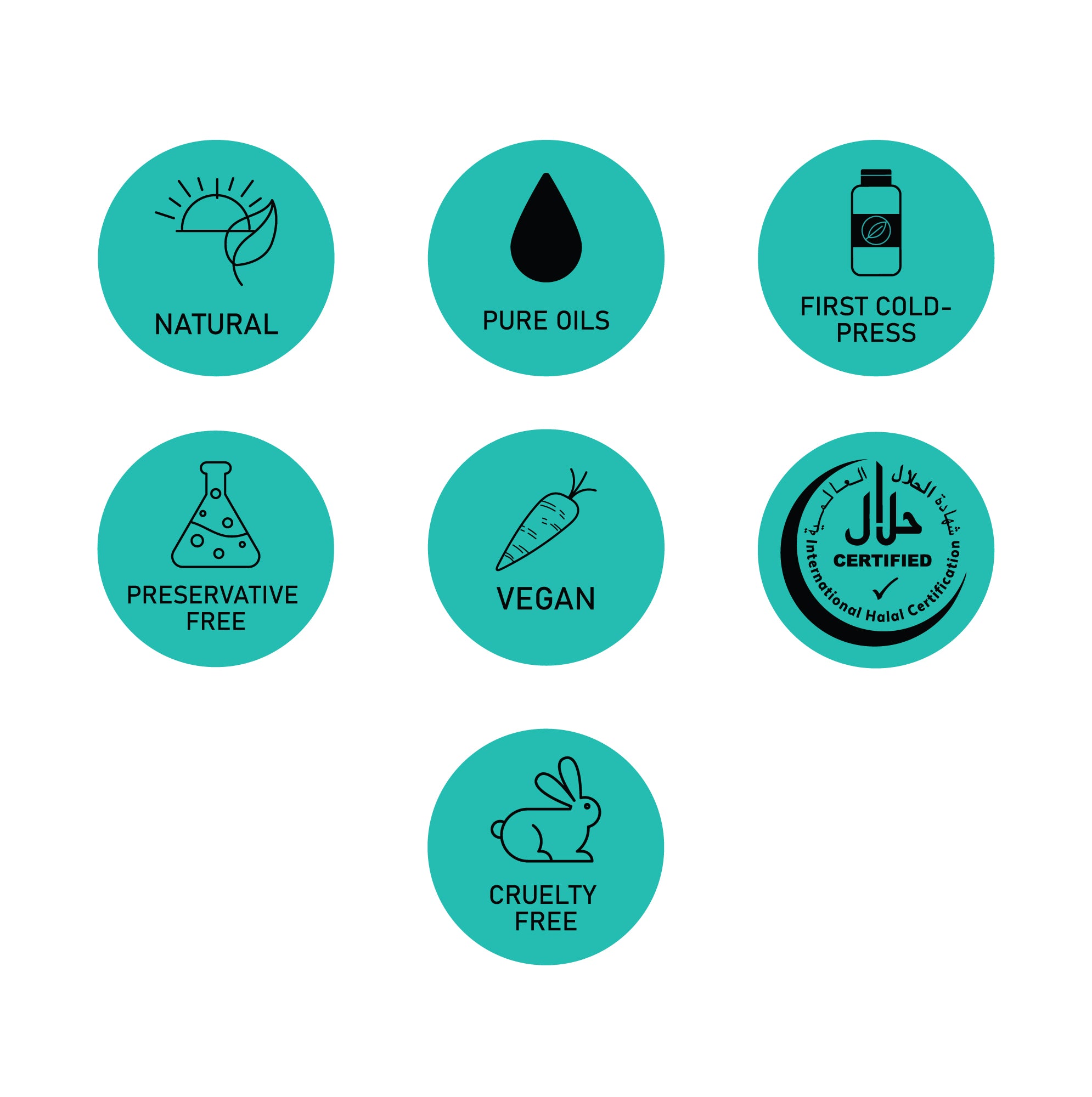 Natural, Pure Oil, First Cold Press, Preservative Free, Vegan, Halal, Cruelty Free